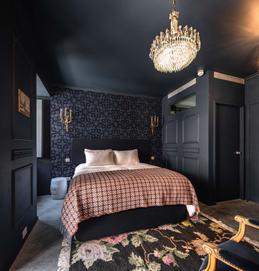 Le papier peint floqué Paseo de Christian Lacroix, le plafond peint couleur marine, les moulures murales, les luminaires à pampilles et les différents objets créent une ambiance Haussmannienne très feutrée.